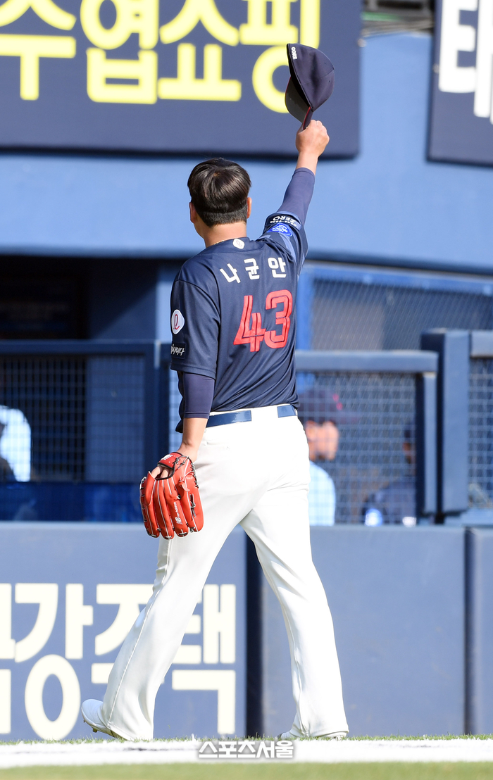롯데 자이언츠 선발투수 나균안이 2일 잠실구장에서 열린 2023 KBO리그 두산 베어스와의 경기 7회말 2사 1-2루 상황에서 마운드에서 내려가면서 자신의 이름을 연호하는 팬들을 향해 모자를 벗어 인사를 하고 있다. 나균안은 6.2이닝 무실점의 호투를 펼쳤다. 2023. 4. 2.