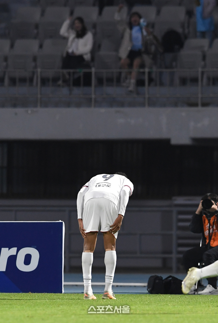 대구FC 에드가가 26일 수원종합운동장에서 열린 하나원큐 K리그1 수원FC와 경기에서 동점골을 넣은 뒤 팬들을 향해 고개 숙여 인사하고 있다. 2023. 4. 26.
