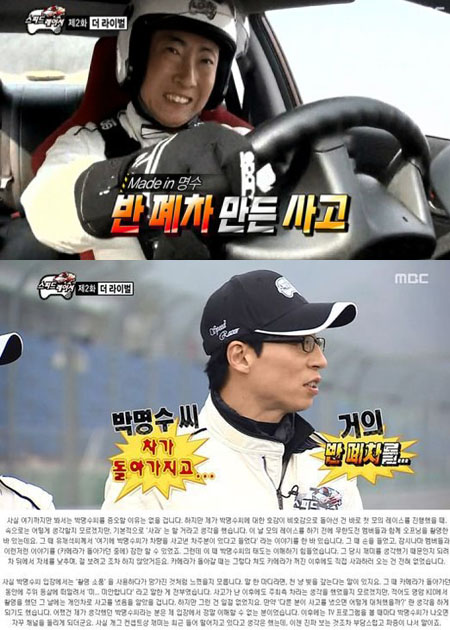 사고 차량 차주는 30일 자신의 블로그에 '무한도전 스피드레이서 뒷 이야기, 박명수를 증오하며' 라는 글을 게재했다. 이 글에서 차주는 "박명수가 운행 중 펜스를 정면으로 들이받는 사고를 냈다"고 밝혔다.