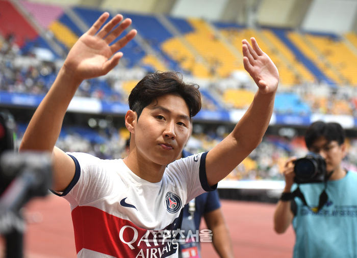 파리생제르맹(PSG) 이강인이 3일 부산아시아드주경기장에서 열린 전북 현대와 쿠팡플레이 시리즈 프리시즌 친선경기 후 그라운드를 돌며 팬들에 인사를 하고 있다. 2023. 8. 3. 부산 | 최승섭기자 thunder@sportsseoul.com