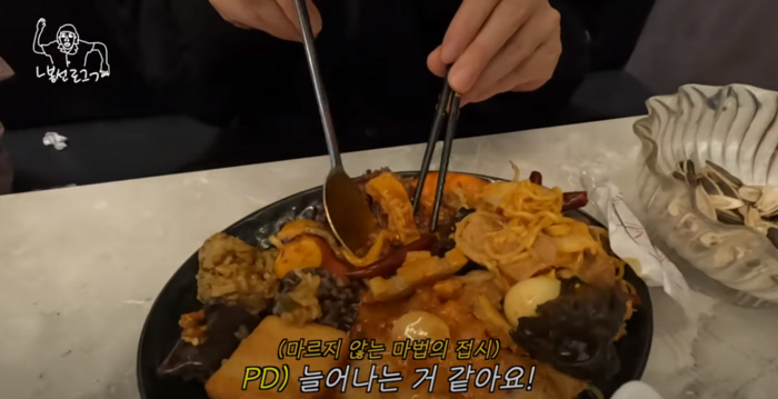 평소 마라탕을 자주 먹지 않는다고 말하던 신봉선은 꿔바로우, 멘보샤, 가지밥, 연변 찹쌀순대, 마라향솥까지 시킨 뒤 마라향솥 재료를 푸짐하게 담아 요청했다.
