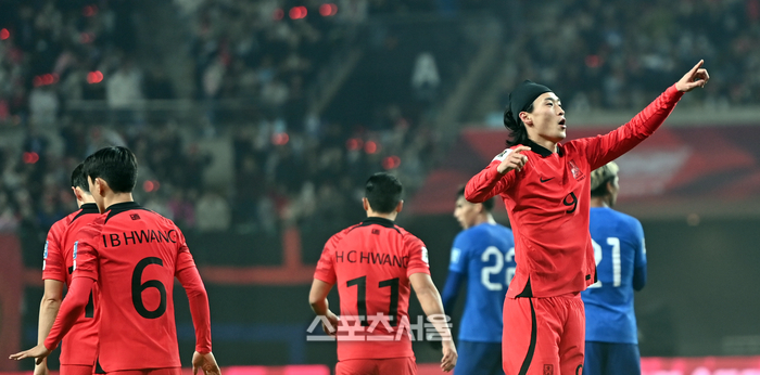 조규성이 서울월드컵경기장에서 열린 2026북중미월드컵 아시아지역 2차예선 대한민국과 싱가포르의 경기 전밤 막판 선제골을 성공시킨후 환호하고 있다. 2023.11.16. 상암 | 강영조기자 kanjo@sportsseoul.com