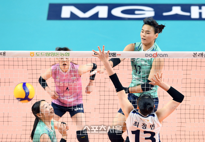 GS칼텍스 문지윤(위)이 29일 장충체육관에서 열린 2023-2024 V리그 여자부 IBK기업은행과 경기에서 속공을 하고 있다. 2023. 11. 29. 박진업기자 upandup@sportsseoul.com