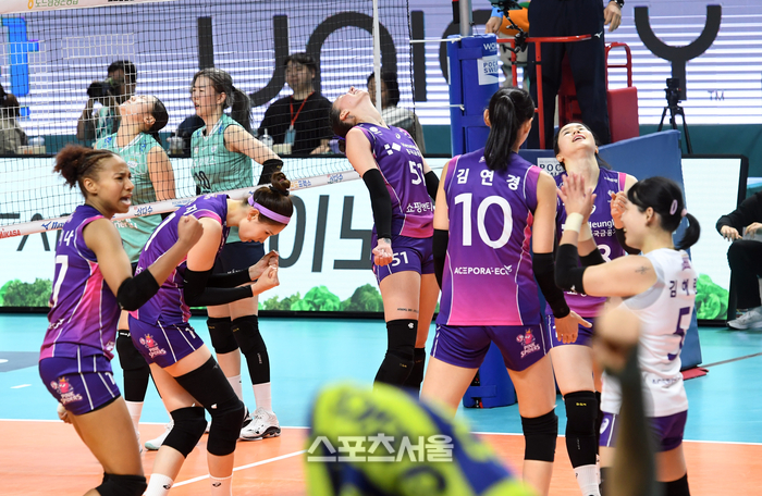 흥국생명 선수들이 2일 서울 장충체육관에서 열린 2023-2024 V리그 여자부 GS칼텍스와 경기에서 윌로우(가운데)의 매치 포인트로 승리를 한 뒤 기뻐하고 있다. |2024. 2. 2. 장충 | 박진업 기자 upandup@sportsseoul.com
