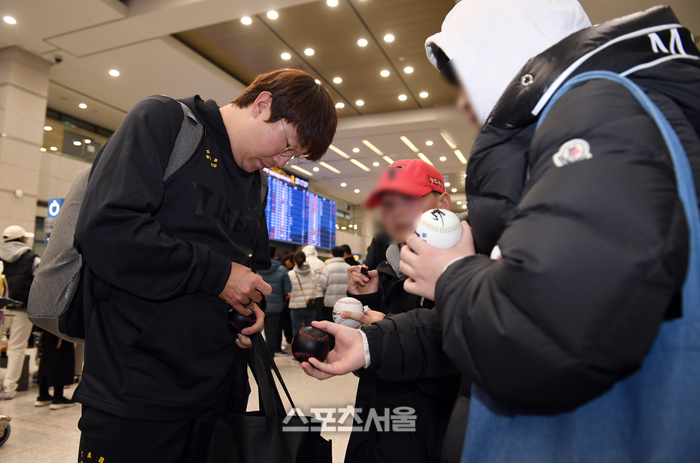 호주에서 1차 스프링캠프를 마친 KIA 타이거즈 양현종이 21일 오후 인천국제공항으로 입국한 뒤 팬들에게 사인을 해주고 있다. KIA 선수단은 다음날인 22일 2차 스프링캠프를 위해 일본 오키나와로 출국한다. 2024. 2. 21. 인천국제공항 | 박진업 기자 upandup@sportsseoul.com
