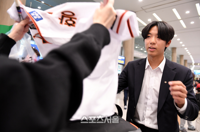 스프링캠프를 마친 한화 황준서가 4일 인천국제공항을 통해 입국 후 팬들에 사인을 해주고 있다. 2024. 3. 4. 인천국제공항 | 최승섭기자 thunder@sportsseoul.com