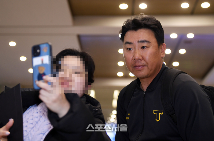 KIA 이범호 감독이 6일 호주 캔버라와 일본 오키나와에서 치른 동계 훈련을 마치고 인천국제공항을 통해 귀국 후 팬의 셀카요청에 응하고 있다. 2024. 3. 6. 인천국제공항 | 최승섭기자 thunder@sportsseoul.com