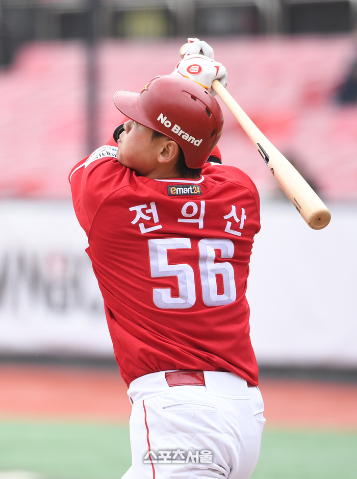 SSG 랜더스 전의산이 12일 수원 KT위즈파크에서 열린 2024 KBO리그 KT 위즈와 시범경기 1회초 1사 KT 선발 엄상백을 상대로 솔로 홈런을 치고 있다. 2024. 3. 12. 수원 | 박진업 기자 upandup@sportsseoul.com