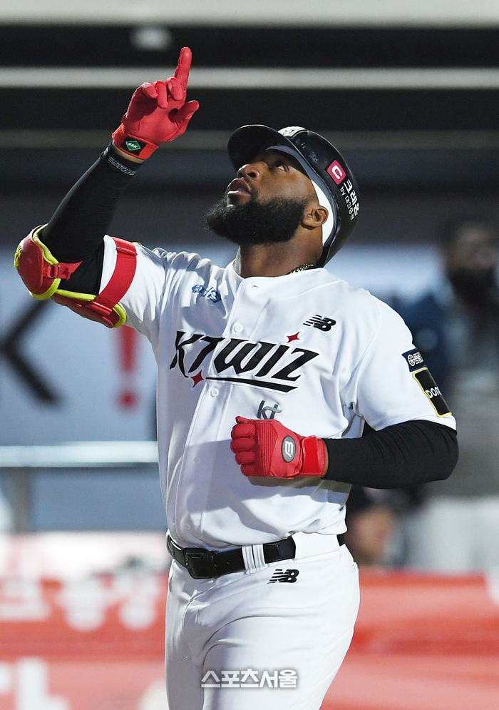 KT 위즈 로하스가 27일 수원 KT위즈파크에서 열린 2024 KBO리그 두산 베어스와 경기 3회말 1사 1루 상황에서 두산 선발 최원준을 상대로 2점 홈런을 치고 세리머니를 하고 있다. 2024. 3. 27. 수원 | 박진업 기자 upandup@sportsseoul.com