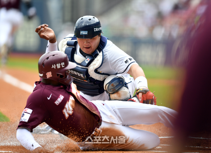 키움 2번타자 도슨이 21일 잠실구장에서 열린 2024프로야구 두산베어스와 키움히어로즈의 경기에서 1회초 무사 3루 3번타자 송성문 내야땅볼때 홈에서 세이프되고 있다. 수비는 포수 김기연. 2024.04.21. 잠실 | 강영조기자 kanjo@sportsseoul.com