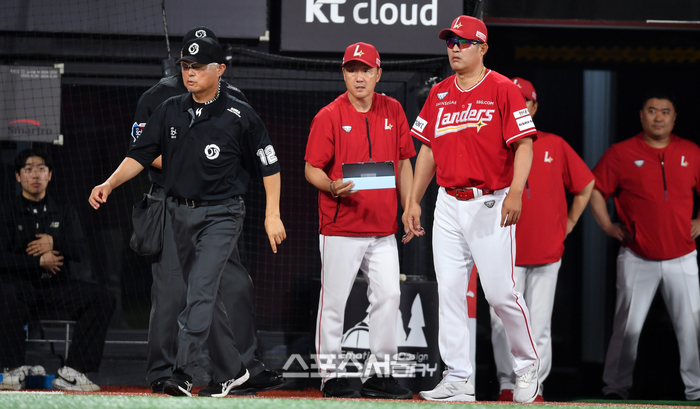 SSG 이숭용 감독이 24일 수원KT위즈파크에서 열리는 2024프로야구 KT위즈와 SSG랜더스의 경기 6회초 에레디아 타석때 구심의 ABS 수신기가 오작동해 판정이 번복되는 사태가 발생하자 구심과 심판들에게 직접 태블릿PC를 통해 확인시켜주고 있다. 2024.07.24.