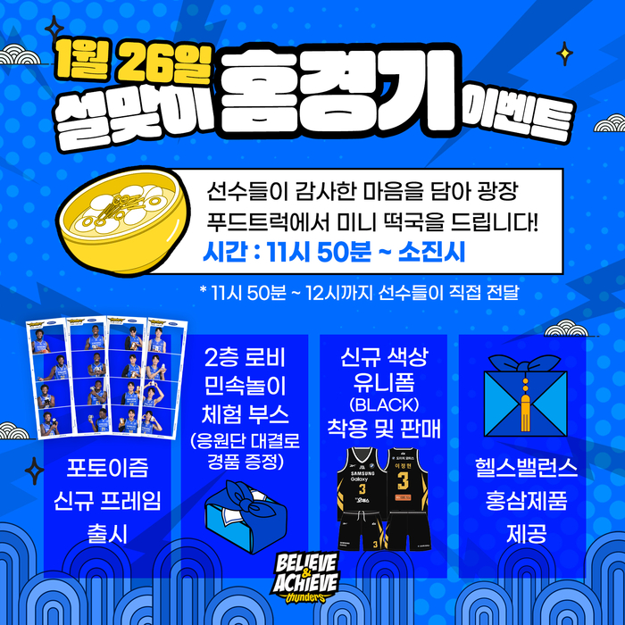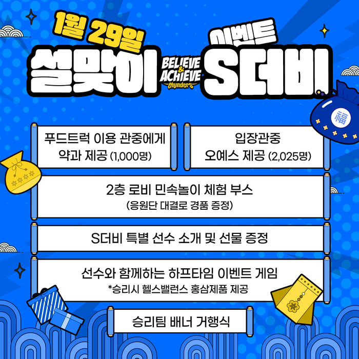 [스포츠서울 | 김동영 기자] 프로농구 서울 삼성이 설 연휴(26일, 29일)에 열리는 홈경기를 방문하는 관중들을 위한 다양한 이벤트를 준비했다.