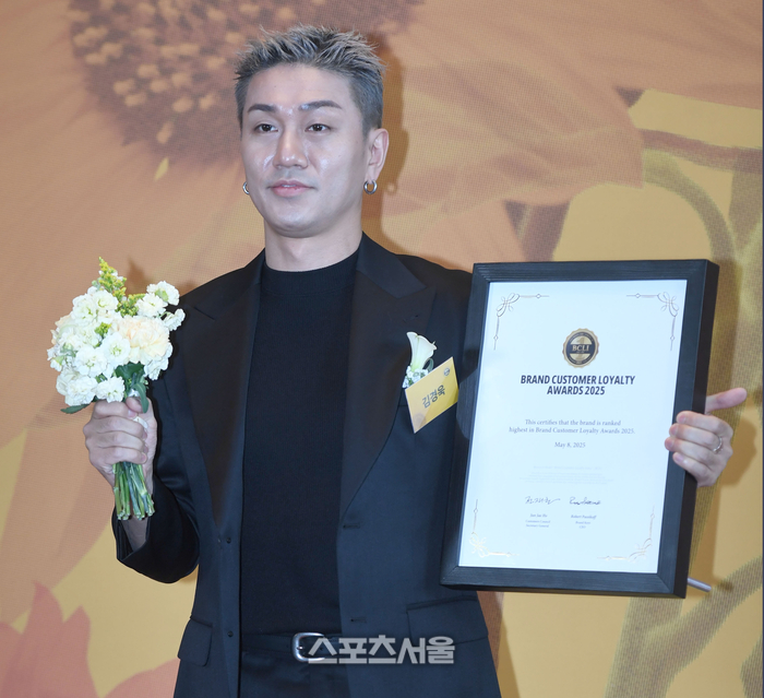 김경옥이 8일 서울 여의도 콘래드호텔에서 열린 2025 브랜드 고객충성도 대상 시상식에서 개그맨 부문상을 받은 후 포즈를 취하고 있다.