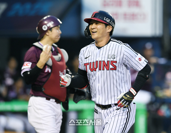 LG 오지환이 15일 잠실구장에서 열린 2025 KBO리그 키움과의 경기 4회말 2사 1루 상황에서 키움 선발 하영민을 상대로 2점 홈런을 친 뒤 세리머니를 하고 있다 오지환의 시즌 5호 홈런. 2025. 5. 15.