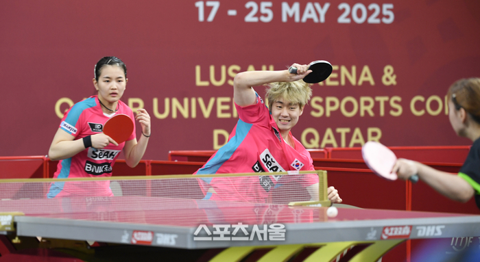 오준성, 김나영이 18일 카타르 도하 카타르대학교 스포츠 콤플렉스에서 열린 2025 국제탁구연맹(ITTF) 세계선수권대회 혼성복식 64강 뉴질랜드 딘 슈, 조슬린 램 조와 경기를 펼치고 있다. 2025. 5. 18. 도하(카타르) | 최승섭기자 thunder@sportsseoul.com