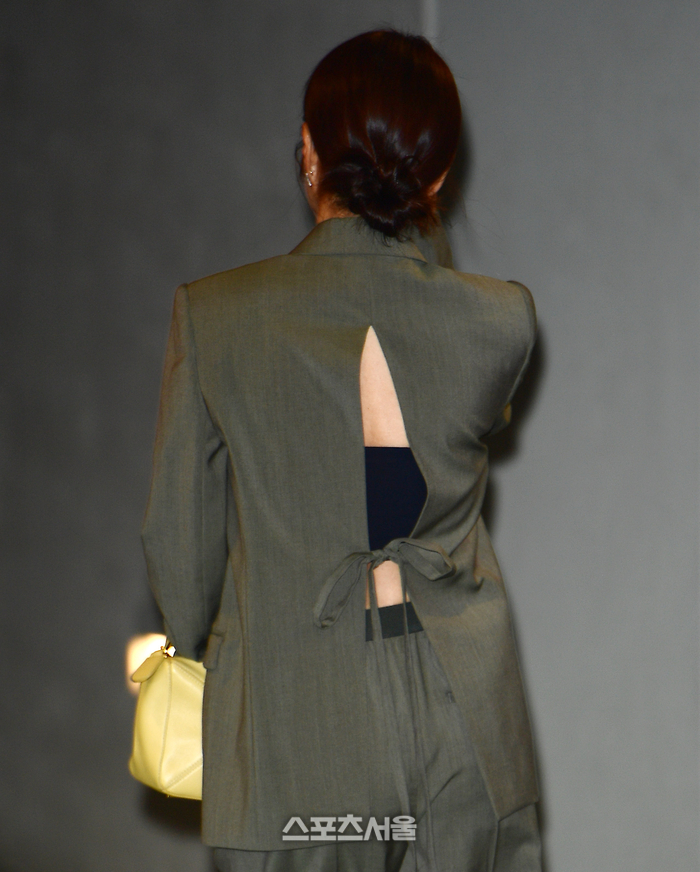 차콜그레이 오버핏 테일러수트와 연노랑 빛이 도는 로에베 퍼즐백이 높은 패션감각을 드러내며 패셔니스타다운 매력을 발산했다.