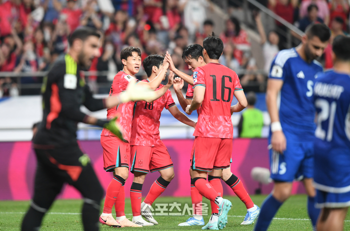 이재성(10번)이 10일 서울월드컵경기장에서 열린 2026 FIFA 북중미 월드컵 3차 예선 쿠웨이트와 경기에서 골을 넣은 후 환호하고 있다.