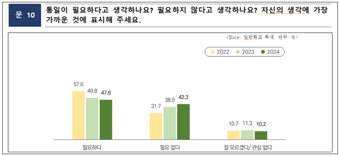 학생 42.3% “통일 불필요” 응답, 2018년 대비 2배 이상 증가
