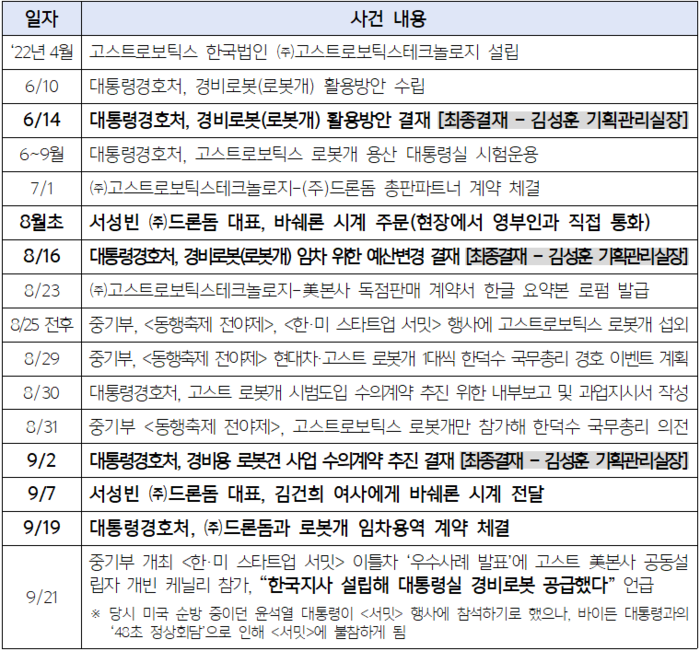 서성빈 前 ㈜드론돔 대표가 김건희 여사에게 바쉐론 시계를 주문하러 왔다며 전화한 시점은 8월 초 정도다. 이 시점 직후인 8월 16일 대통령경호처는 기존에 ‘위치추적장비 시범도입’ 사업에 편성됐던 예산을 변경해 로봇개(경비로봇) 임차비 1800만원을 편성했다. 예산 변경에 관한 공문 역시 김성훈 기획관리실장이 최종 결재했다.