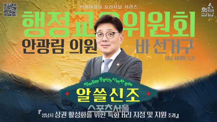 〔스포츠서울│성남=좌승훈기자〕성남시의회는 ‘알쓸신조’영상으로 안광림 의원 등 16명이 공동 발의한 ‘상권 활성화를 위한 특화거리 지정 및 지원 조례’를 10월1일 오후 5시 의회 공식 SNS에 게시한다고 30일 밝혔다.