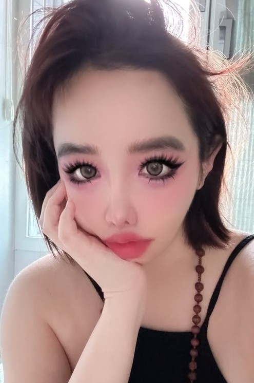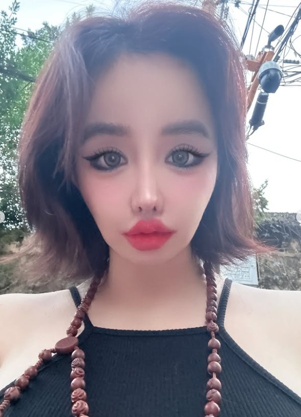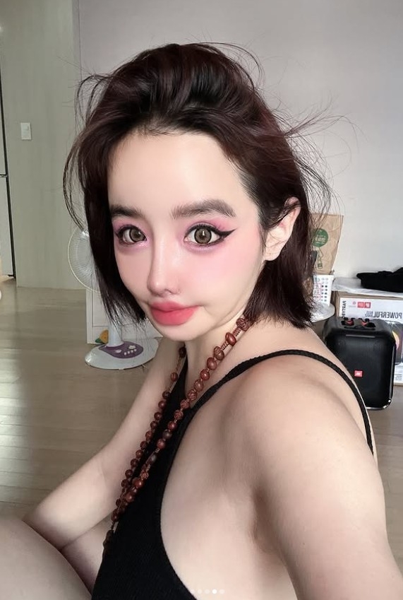 집내부에서 찍은듯한 셀카에서 박봄은 검정 민소매 차림에 구슬 목걸이를 걸고, 인형 같은 풀메이크업을 선보인다. 긴 속눈썹으로 눈매를 강조하고 눈 밑부터 광대까지 핫핑크 블러셔를 넓게 바른 과감한 색조가 시선을 사로잡는다. 입술은 톤 다운된 핑크 컬러로 볼륨감을 더해 독특하면서도 몽환적인 분위기를 완성한다.