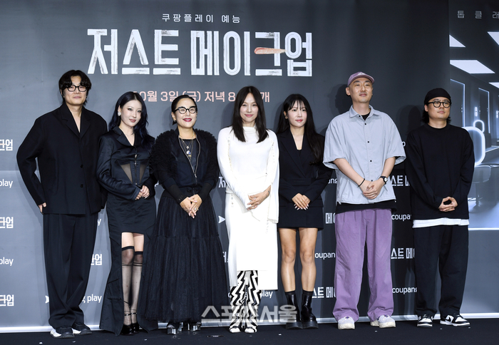 1일 서울 광진구 풀만 앰버서더 이스트폴 호텔에서 진행된 쿠팡플레이 ‘저스트 메이크업’ 제작발표회에서 출연자들이 취재진을 향해 포즈를 취하고 있다. 왼쪽부터 이진수, 이사배, 정샘물, 이효리, 서옥, 심우진 PD, 박성환 PD.