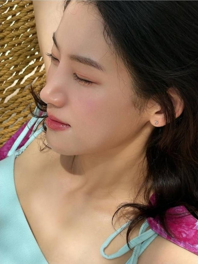 햇살 아래 해먹에 기대 미소를 짓는 컷, 비치 타월을 양팔로 펼쳐 프레임을 채운 컷 등 구성도 다양하다.