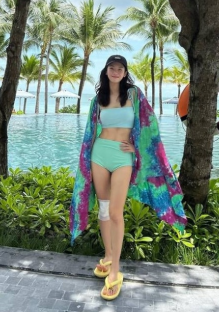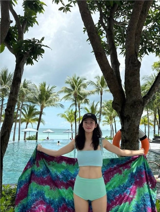 공개된 사진 한 박주현은 야자수가 둘러싼 인피니티풀을 배경으로 민트 톤의 스윔웨어와 타이다이 비치로브를 매치했다.