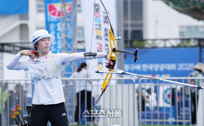 조한이(순천여고)가 2일 광주광역시 5·18 민주광장에서 열린 ‘현대자동차 정몽구배 한국양궁대회 2025’ 리커브 여자 통합 개인 8강전에서 슈팅을 하고 있다. 2025. 10. 2. 대한양궁협회 제공.