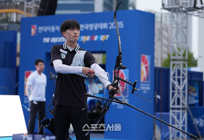 김종우(한국체대)가 2일 광주광역시 5·18 민주광장에서 열린 ‘현대자동차 정몽구배 한국양궁대회 2025’ 리커브 남자 통합 개인 8강전에서 슈팅을 하고 있다. 2025. 10. 2. 대한양궁협회 제공.