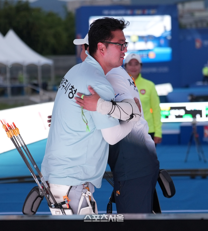 이우석(오른쪽, 코오롱엑스텐보이즈)이 2일 광주광역시 5·18 민주광장에서 열린 ‘현대자동차 정몽구배 한국양궁대회 2025’ 리커브 남자 통합 개인 8강전에서 김우진(청주시청)을 꺾은 뒤 포옹을 하고 있다. 2025. 10. 2. 대한양궁협회 제공.