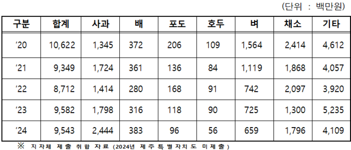 작물별로는 채소류의 피해가 가장 컸고, 다음으로 사과, 벼, 배 순이었다. 채소류는 5년 동안 94억 7500만원, 사과는 87억 2500만원, 벼는 48억 900만원, 배는 17억 1200만원이었으며 최근 사과는 2022년 14억 1400만원에서 2024년 24억 4400만원으로 그 피해액이 대폭 늘었다.