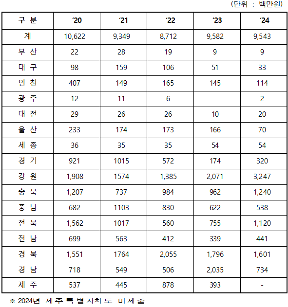 피해는 특히 농촌지역에서 더 두드러졌다. 가장 피해가 큰 지역은 강원도로 피해 규모가 5년 동안 총 101억 8500만원에 달했다. 2022년에는 13억 8500만원이던 피해가 2024년에는 32억 4700만원으로 거의 60% 가까이 증가했다. 뒤를 이어 △ 경북 71억 6600만원, △ 충북 51억 3000만원, △ 전북 50억 1400만원 순이었다. 반면 광주 △ 2900만원, △ 부산 7800만원, △ 대전 9100만원, △ 세종시 1억 6000만원에 불과했다.