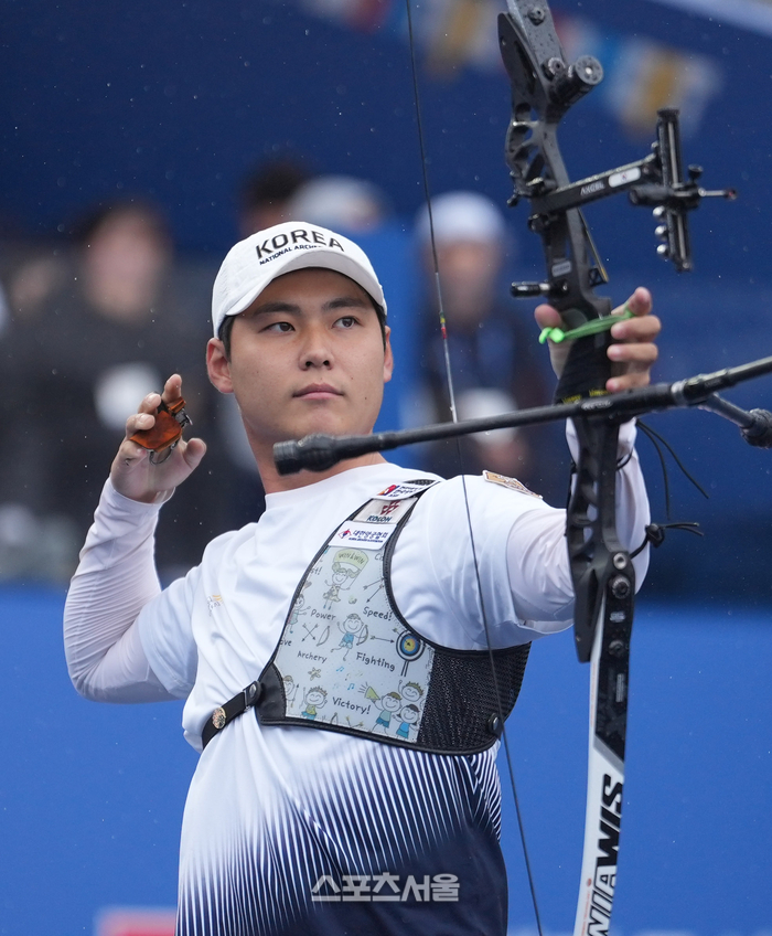 이우석(코오롱엑스텐보이즈)이 3일 광주광역시 5·18 민주광장에서 열린 ‘현대자동차 정몽구배 한국양궁대회 2025’ 시상식에서 리커브 남자 개인 결승전에서 슈팅을 하고 있다. 대한양궁협회 제공.