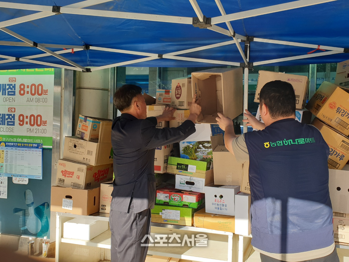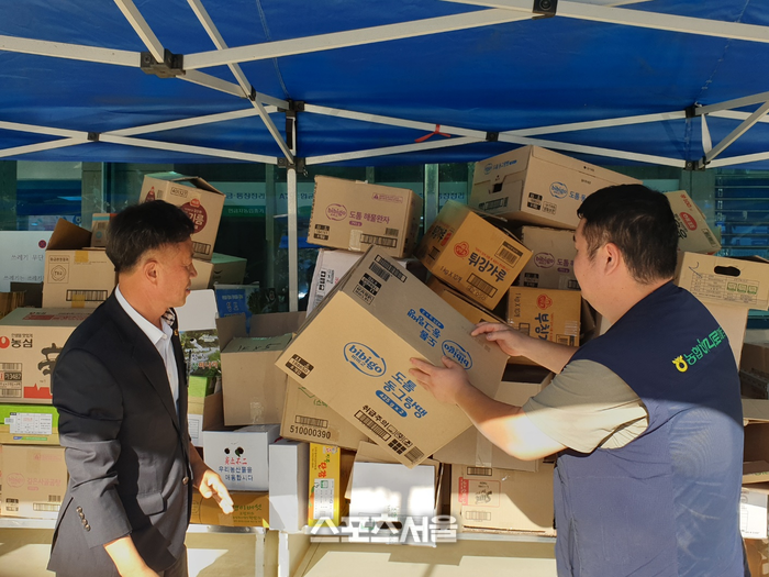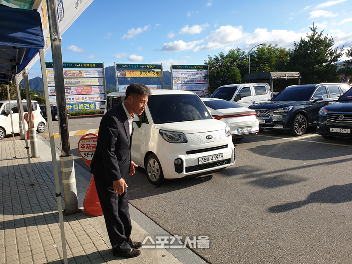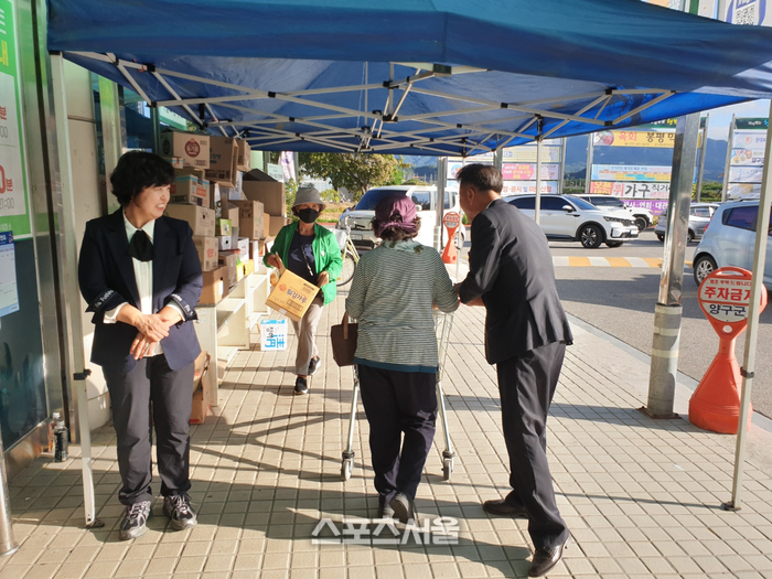[스포츠서울ㅣ양구=김기원기자]김왕규 강원특별자치도의원은 추석 장보기에 나선 지역주민들에게 인사를 하는 도중 늦은 오후부터 밀려드는 차량과 주민들을 위해 잠시 인사를 멈추고 카트 밀어드리기, 주차안내, 박스정리 등 일일도우미로 나섰다.