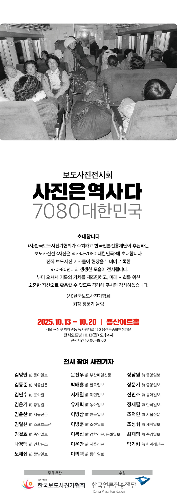 장문기 한국보도사진가협회 회장은 “1970~80년대는 한국 사회가 격동적으로 변화한 시기”라며 “당시 현장을 누비던 보도사진 기자들의 기록을 통해 역사의 현장을 생생히 느끼고, 기록의 가치를 되새기는 자리가 되길 바란다”고 밝혔다.