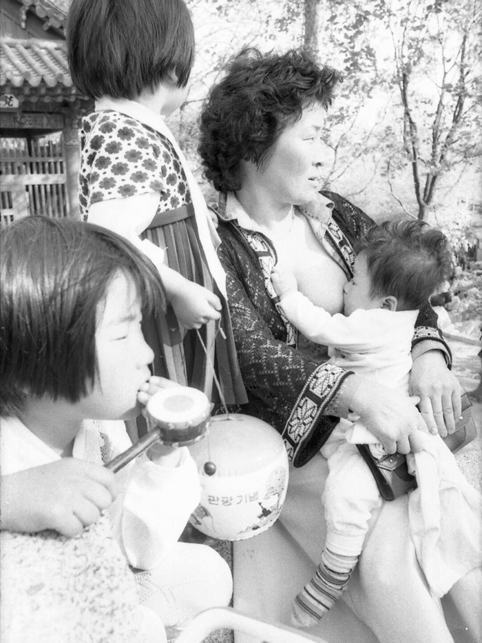 1977년 봄 햇살 가득한 어린이대공원에서 만난 한 어머니의 모습은 보도사진이 지닌 인간적 온기를 상징한다. 막내는 젖을 물고, 둘째는 엄마 품에 기대며, 첫째는 장난감 북을 두드리며 세상을 배운다. 세 아이가 각기 다른 순간을 살아가지만 모두를 품은 어머니의 가슴은 하나의 크고 깊은 사랑이었다.