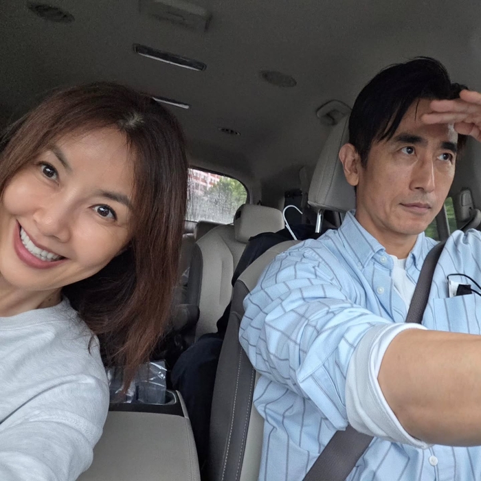 공개된 사진 속에는 차 안에서 똑같은 포즈를 취하고 있는 신애라-차인표 부부의 모습이 담겨 있다.