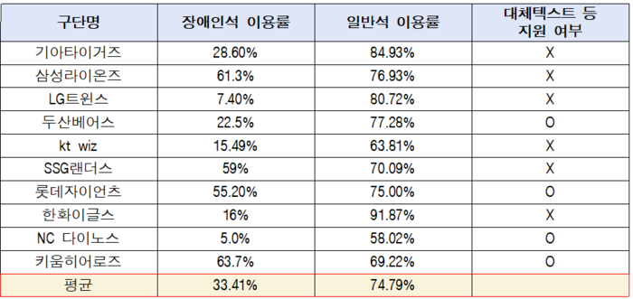 예매 접근성 관련 문제도 심각하다. 10개 구단은 대체로 온라인 예매만 허용하고 있으면서도, 시각장애인을 위한 대체텍스트가 지원되는 구단은 4곳뿐이다. 이로 인해 장애인석 예매율은 2024년 기준 평균 33.41%로, 일반석(74.79%)의 절반에도 미치지 못했다.