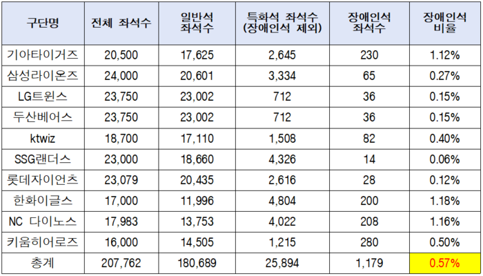7일 더불어민주당 민형배 의원(국회 문화체육관광위원회)은 “문화체육관광부로부터 제출받은 자료에 따르면, 프로야구장의 장애인석 비율은 전체 좌석의 0.57%에 불과했다”라며, ‘장애인·노인·임산부 등의 편의증진 보장에 관한 법률 시행령’이 규정한 ‘좌석의 1% 이상, 2000석 이상은 최소 20석 이상’ 기준조차 충족하지 못한 곳도 있었다”고 밝혔다.