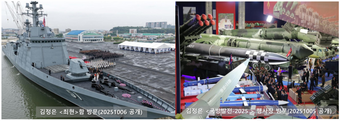 지난 6일에는 김정은 위원장이 무장장비 전시회 일환으로 신형 구축함 최현함을 찾아 현지 지도를 하는 모습을 북한이 공개했다. 함교·전투통제실 콘솔 모니터에 서해 북방한계선 NLL을 경계로 한 서해 지역 전자해도를 노출하기도 했는데, 서해 NLL에서 작전하는 우리 해군 함정에 대한 장거리 공격 능력을 과시하려는 의도적 노출로 보인다.