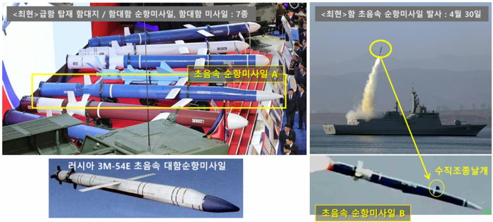 이어 유 의원은 북한이 공개한 러시아의 초음속 대함 순항미사일(3M-54E)과 형상이 판박이인 순항미사일에 대해 “초음속 순항미사일은 2종을 개발하고 있는 것으로 보인다”라고 분석했다.