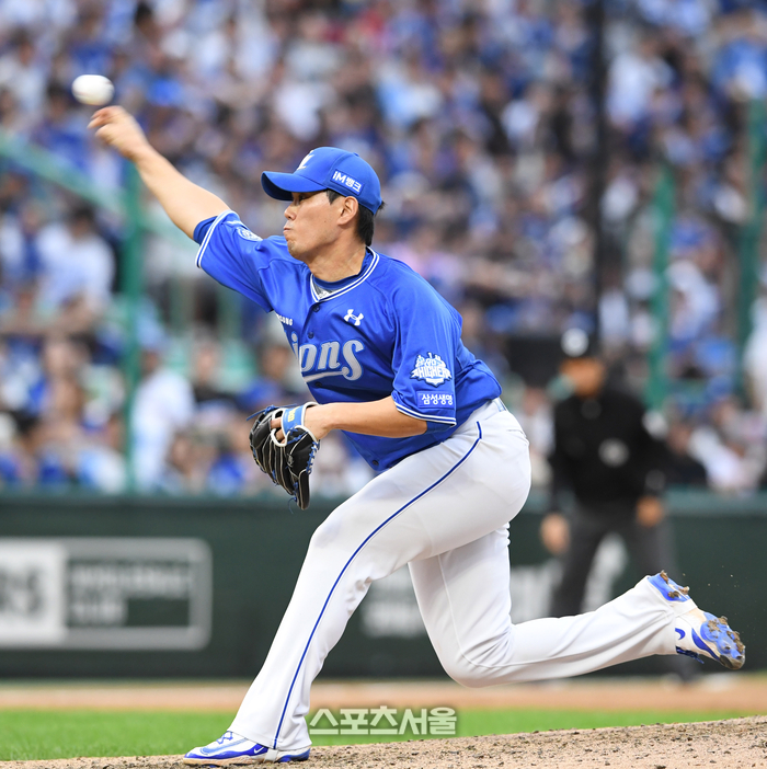 삼성 김재윤이 9일 인천 SSG랜더스필드에서 열린 2025 KBO리그 SSG와의 준플레이오프 1차전 9회말 등판해 힘차게 공을 던지고 있다. 2025. 10. 9.