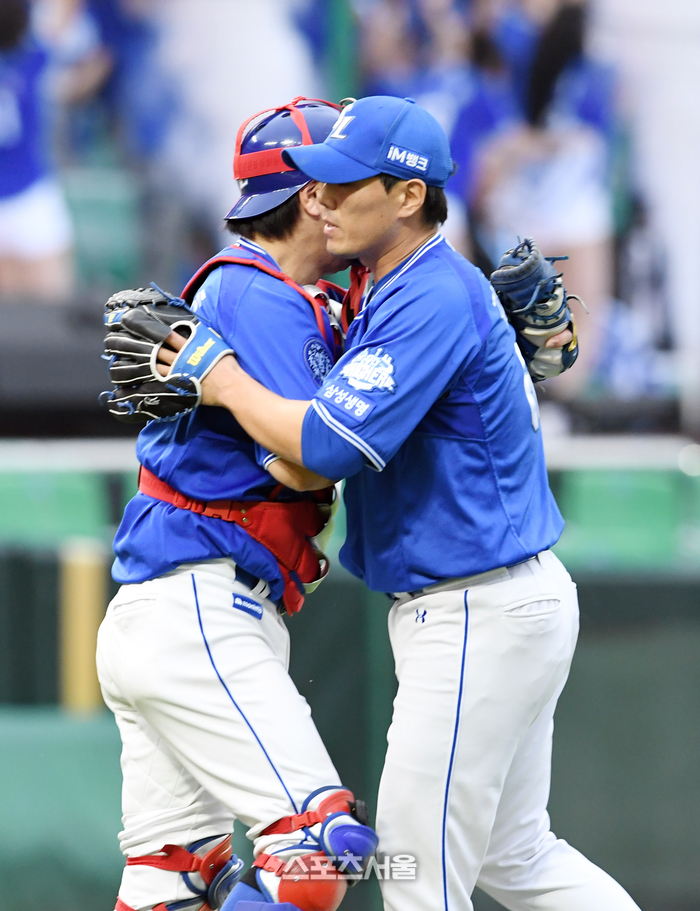 삼성 김재윤이 9일 인천 SSG랜더스필드에서 열린 2025 KBO리그 SSG와의 준플레이오프 1차전 9회말 등판해 승리를 지켜낸 뒤 포수 강민호와 포옹을 하고 있다. 2025. 10. 9.