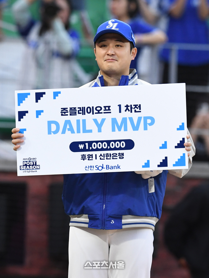 삼성 최원태가 9일 인천 SSG랜더스필드에서 열린 2025 KBO리그 SSG와의 준플레이오프 1차전에서 6이닝 무실점을 승리를 이끌고 MVP로 선정된 뒤 취재진을 향해 포즈를 취하고 있다. 2025. 10. 9.