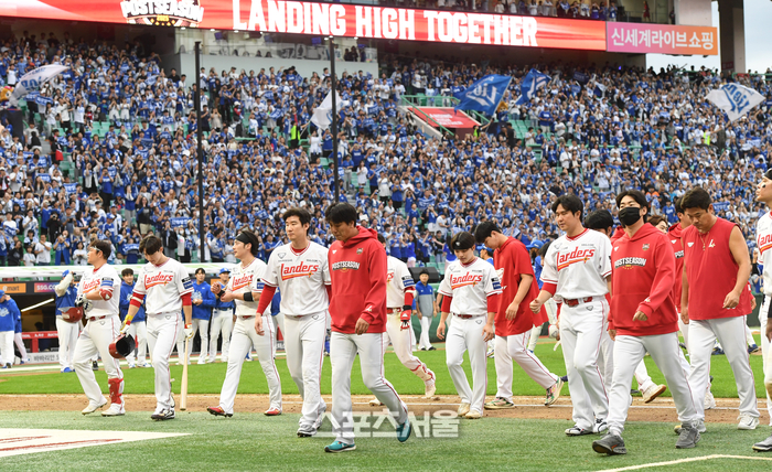 SSG 선수들이 9일 인천 SSG랜더스필드에서 열린 2025 KBO리그 삼성과의 준플레이오프 1차전에서 2-5로 패한 뒤 팬들에게 인사를 하고 더그아웃으로 돌아가고 있다. 2025. 10. 9.