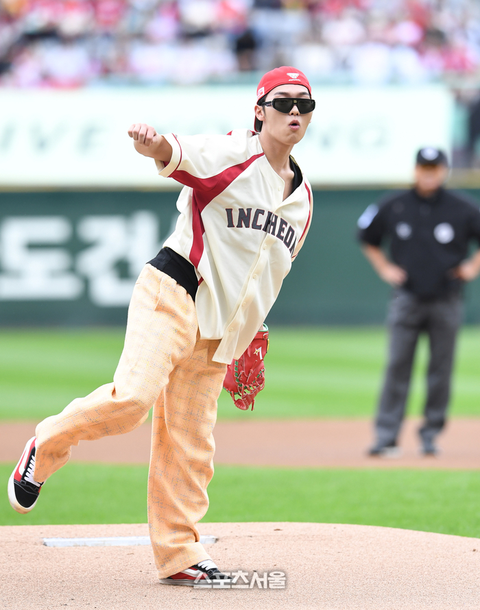 배우 최현욱이 9일 인천 SSG랜더스필드에서 열린 2025 KBO리그 삼성과 SSG의 준플레이오프 1차전에 앞서 시구를 한 뒤 시타자 머리 위로 날아간 공에 깜짝 놀라고 있다. 2025. 10. 9.