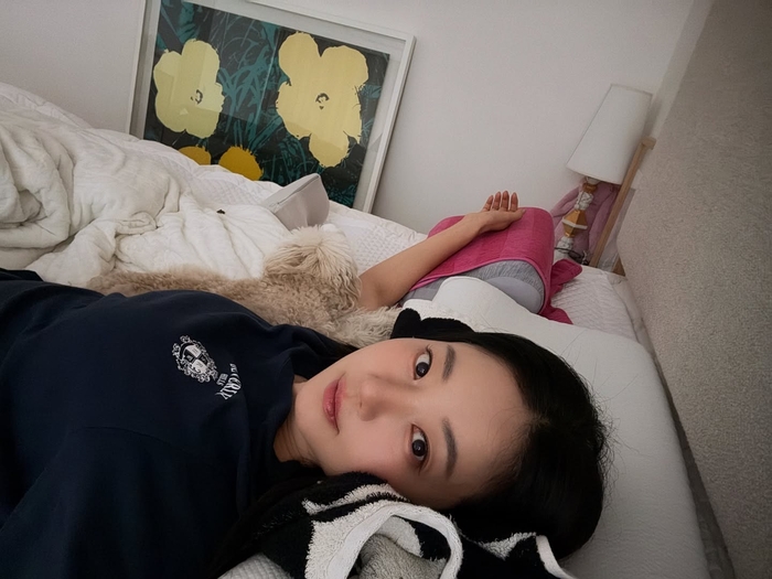 공개된 사진 속 김사랑은 편안한 네이비색 맨투맨 티셔츠 차림으로 침대에 누워 반려견과 함께 휴식을 취하고 있는 모습이다.