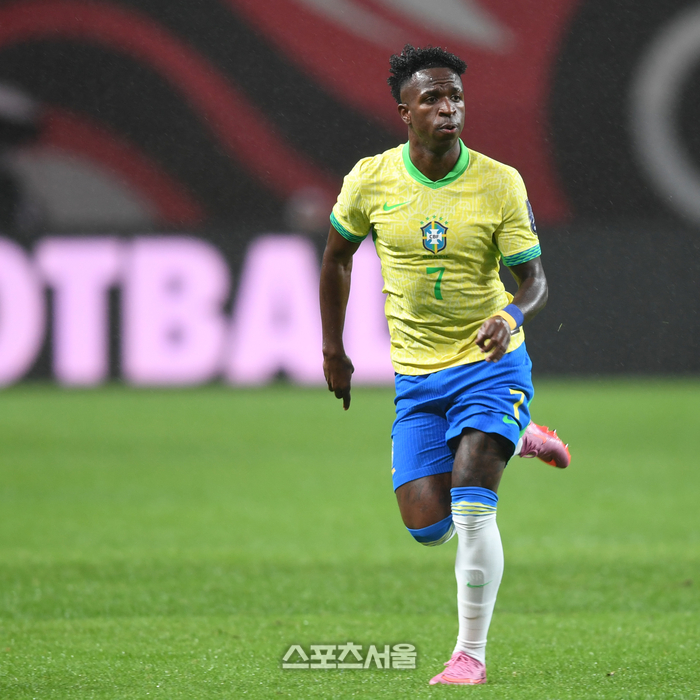 브라질 비니시우스가 10일 서울월드컵경기장에서 열린 남자 축구 국가대표 평가전 한국과 경기에서 전력질주하고 있다.