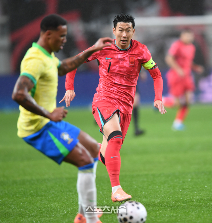 손흥민이 10일 서울월드컵경기장에서 열린 남자 축구 국가대표 평가전 브라질과 경기에서 공격을 저지하고 있다.